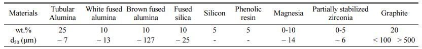 Recently, the simultaneous use of several oxides in the refractory composition has led to the formation of another class of refractories called alumina-magnesia-graphite (AMG) [9] and alumina-zirconia-graphite (AZG) [10] refractories. These classes of materials have attracted a lot of attention and researchers have studied the parameters affecting their properties. Muñoz et al. carefully analyzed texture, composition and micro- structure of three commercial AMC bricks and studied their dimensional change and thermal and mechanical properties [11]. They also evaluated the slag corrosion using experimental data and thermodynamic simulation [12]. Klewski et al. studied the effect of different alumina sources with different grain size on the final properties of AMC bricks [13]. Mukhopadhyay et al. discussed on the effect of MgO grain size and found that spinelizarion reaction and permanent linear change of refractory are directly related to the total surface area of magnesia [14]. Babakhanova and Aripova changed the corundum, talc and graphite amount and showed that the maximum slag strength is related to the composition with the lowest porosity [15]. Yu et al. investigated the effect of manufacturing parameters such as pressure, particle size distribution, sintering temperature and time on the final properties of AZG refractories, and they found that the use of alumina with high ratio of coarse to fine particle has led to an increase in density [16-17].