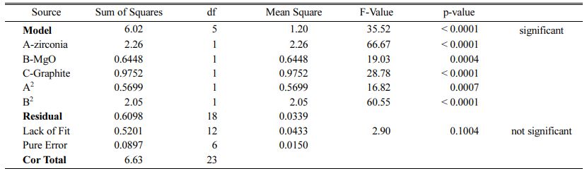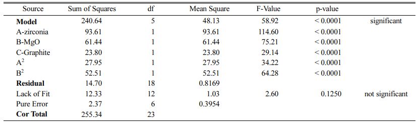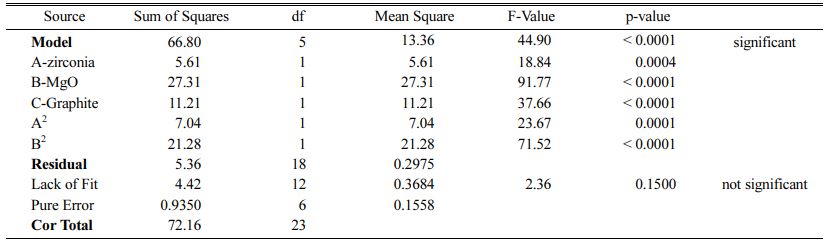 Table 5 ANOVA test for CCD in the case of modulus of rupture of AMZG refractory composite |
