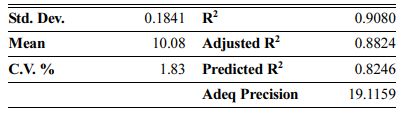 As can be seen, the predicted R2 of each model is in reasonable agreement with its adjusted R2; i.e. the difference is less than 0.2. The adequate precision, which measures the signal-to-noise ratio, also indicates that the models can be used to navigate the design space.