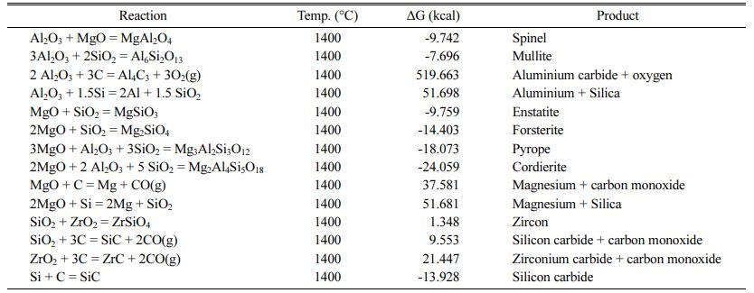 As can be seen, the changes in standard Gibbs free energy for the formation of spinel, mullite, enstatite, forsterite, pyrope, cordierite and silicon carbide are negative. Among of all the reactions, the standard Gibbs free energy of the cordierite formation is more negative than the other reactions at 1400 oC. Accordingly, first the cordierite phase is completely formed [35]. The binary reaction between MgO-Al2O3 and MgO-SiO2 has approximately the same change in standard free energy change. According to the Sembiring et al. studies, spinel formation is most likely as a result of diffusion between alumina and magnesia [36]. The spinel for- mation reaction starts above 1050 oC and peaks at 1600 oC. The presence of carbon hinders the spinelization reaction, while zirconia accelerates it [26]. Silicon carbide formation also has negative standard Gibbs free energy. Finally, X-ray diffraction analysis has been applied in the investigation of phase formation. XRD pattern of the best composition is shown in Fig. 5.