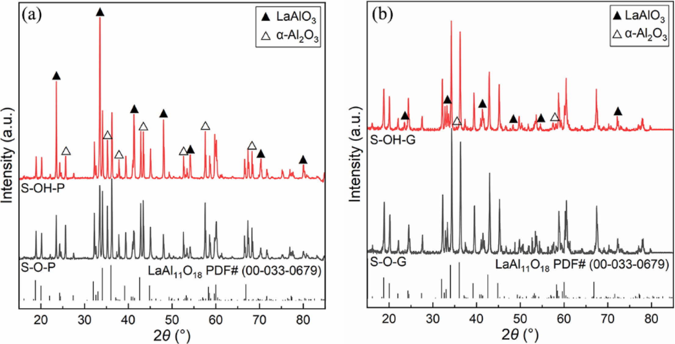 Fig. 1 shows the XRD patterns of different samples after being calcined at 1600 oC for 5 h, and their main crystalline phases are LaAl11O18, and their secondary crystalline phases are LaAlO3 and α-Al2O3. Compared with different aluminum source samples (such as samples S-O-P or S-OH-P), the relative intensity of the diffraction peak of LaAl11O18 in the XRD spectrum of sample S-O-P synthesized from alumina is higher, which means that the target phase content is higher, as shown in Fig. 1(a). Compared with different forming process samples (such as samples S-O-P or S-O-G), the XRD spectra of sample S-O-G synthesized from green samples have a lower relative intensity of the diffraction peaks of the intermediate products (LaAlO3 and α-Al2O3), which means that the reaction is more complete as shown in Fig. 1(b).