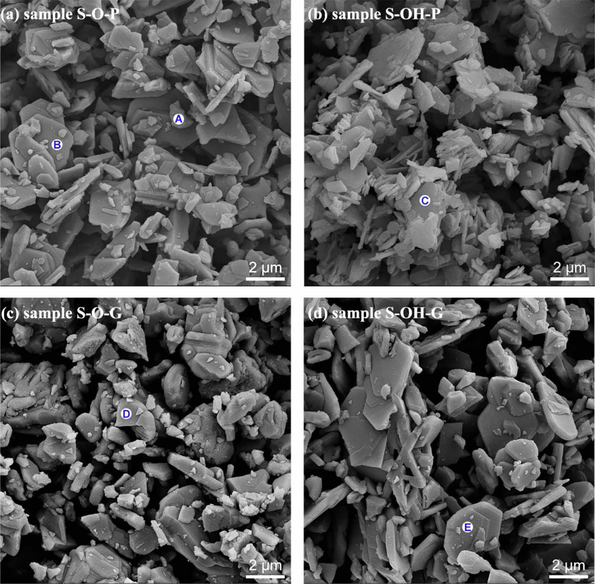 Fig. 3 presents the SEM images of different samples after being calcined at 1600 oC for 5 h. For samples S-O-P and S-O-G, their grains show two micron-scale structures, plate-like and granular, and sample S-O-G has no obvious flaking of sample S-O-P (Fig. 3(a) and (c)). Combining the EDS results shown in Table 2 with corresponding XRD patterns, it can be seen that the lamellar grains of sample S-O-P are LaAl11O18, and the granular grains are LaAlO3, which is an unresponsive intermediate phase. The granular grains of sample S-O-G are still LaAl11O18. Similarly, comparing the SEM images of samples S-OH-P and S-OH-G, it is found that the grain size of sample S-OH-P synthesized directly from powders is smaller (~1 μm), the plate grain thickness is relatively thin. The grain development of sample S-OH-P synthesized from compacted billet is higher (~3 μm). In addition, the EDS results of points C and E indicate that all lamellar grains are LaAl11O18, as shown in Table 2.