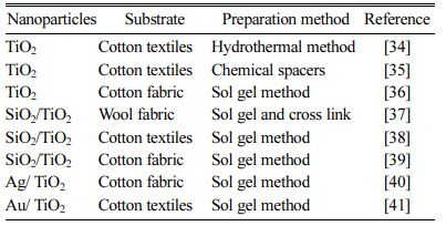 Scientists have tried various methods to fix titanium dioxide on various polymers and fiber fabrics, including sol-gel method, hydrothermal method, magnetron sput- tering method, electrochemical and chemical method, thermo-synthesizing method, Impregnation method, etc. Table 1 summarizes the methods of fixing titanium dioxide on different polymer and fabric substrates.