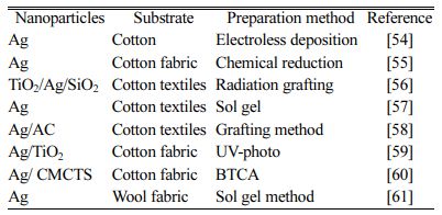 There are two main methods of loading nanoparticles on fiber fabrics, i.e., fibril processing and post-treatment processing. The preparation method of nano-silver finished fiber fabric is mainly post-processing, that is, finishing nano-silver antibacterial agent on fiber fabric by dipping, padding, deposition or coating. The method has simple process and relatively low cost.It is suitable for various textiles made of natural fibers or synthetic fibers, and is the most commonly used method for finishing textile fabrics with nano silver antibacterial agents at present. Table 2 lists some methods of loading nano silver on different fiber fabrics.