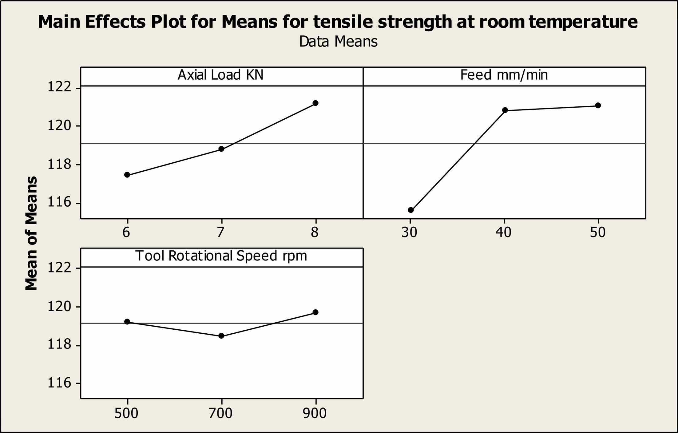Fig. 3 Main effect plot for means for tensile strength at room temperature |