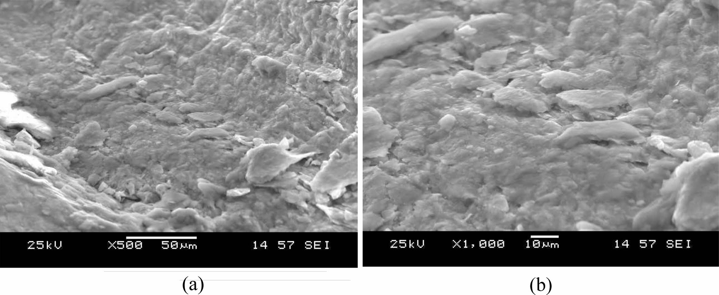 Fig. 5 SEM analysis - Microstructure of AA1100 welded joints by FSW: (a) 500x and (b) 1000x. |