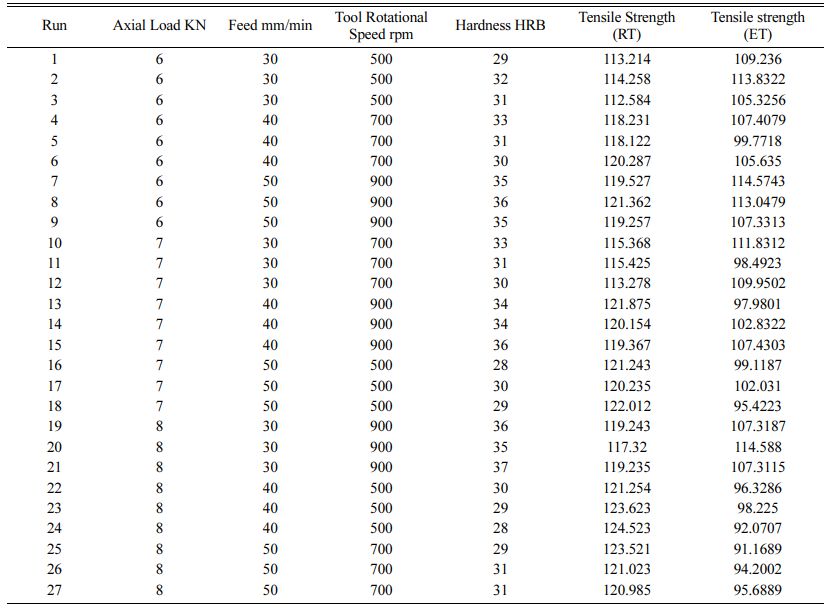 In this work axial load, tool rotational speed and feed are selected as the process parameters and the hardness and tensile strength at room and elevated temperatures are considered as the responses. L27 orthogonal array is used and nine experiments are conducted and the responses are recorded against each experiment. The Taguchi grey relational analysis is used to optimize the welding process parameters. The responses considered in this work are; hardness, tensile strength at room and elevated temperatures. Rockwell hardness is measured and recorded and tensile test are carried out as per ASTM standards and recorded. The metallographic study is considered to examine the heat affected zone, thermo-mechanically affected zone and stir zone generated during FSW process. The experimental data is presented in Table 1.