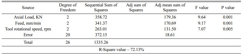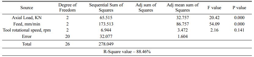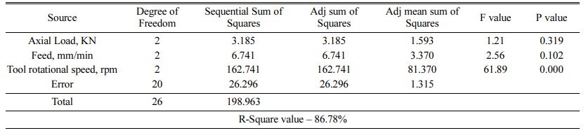 Analysis of variance is useful in determining the most significant and predominant factor affecting the process parameters during FSW of AA1100 Aluminium alloy. The level of significance is carried out 5% signi- ficance level. Table 2. shows the results of analysis of variance for hardness (ANOVA) for welding AA1100 using FSW process. It is observed that the tool rotational speed plays a predominant role and it is the most significant in determining the hardness of the welded specimen. The next significant parameter is feed and it is followed by the axial load. Table 3. shows the results of analysis of variance for tensile strength at room temperature (ANOVA) for welding AA1100 using FSW process. It is observed that the feed plays a pre- dominant role and it is the most significant in deter- mining the hardness of the welded specimen. The next significant parameter is axial load and it is followed by the tool rotational speed. Table 4. shows the results of analysis of variance for tensile strength at elevated tem- perature (ANOVA) for welding AA1100 using FSW process. It is observed that the feed and axial plays a predominant role and it is the most significant in deter- mining the hardness of the welded specimen. Taguchi analysis is carried out using Design of experts and the main effects plots for means for hardness are presented in Fig. 2. It is observed that as the tool rotational speed is increased the hardness of the welded specimen also increases linearly. Whereas the increase in axial load and feed of the FSW process shows a minimum change in variation of the hardness of the welded specimen. The main effects plots for means for tensile strength at room temperature are presented in Fig. 3. It is observed that as the feed rate and axial load is increased the tensile strength at room temperature of the welded specimen also increases linearly. The main effects plots for means for tensile strength at elevated temperature are presented in Fig. 4. It is observed that as the axial load is decreased the tensile strength at the elevated temperature of the welded specimen also increases linearly. From the mean effects plots for the tensile strength at the room temperature and elevated tempera- tures, it is concluded that the tensile strength of the specimen increases with increase in tool rotational speed due to high amount of friction generated at the tool shoulder and tool pin. Due to this high heat generation the material flow is enhanced and creating a uniform coalescence of the weld in the welding zone. When the tool rotation speed is low, the uniformity of the heat generation is highly affected thereby producing porosities in the weld zone there by reducing the tensile strength of the specimen. Also it is concluded that the hardness of the weld zone increases to a very minimum proportion when compared to the parent material due to improvement in the grain size of the stir zone during the FSW process is facilitated.