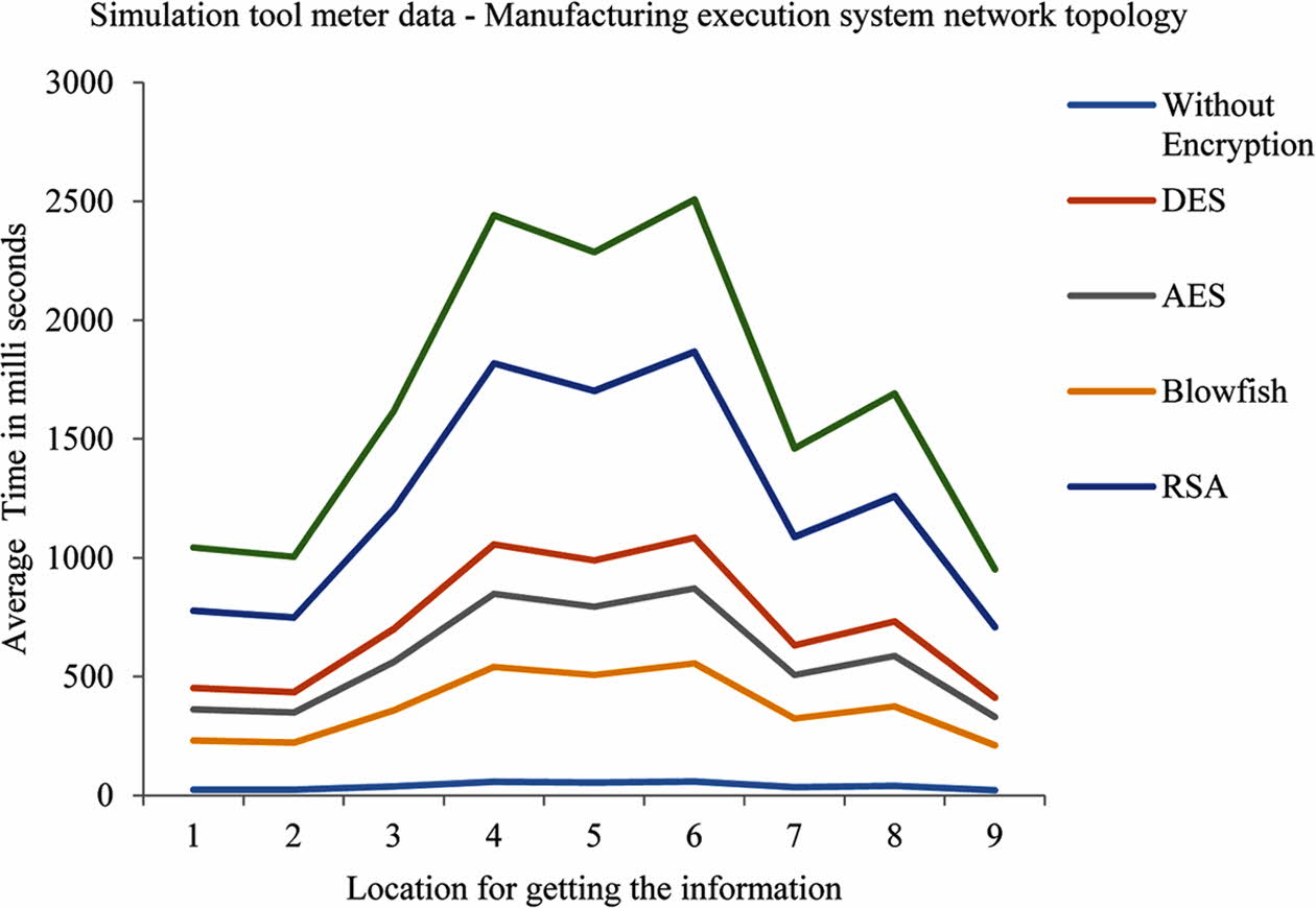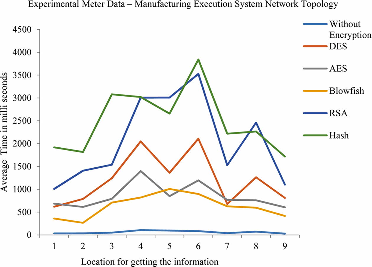 The significant features are found to be feed rate and hardness and most influential. Furthermore the depth of cut and the harness of the ceramic tool seems to be less contributory function when compared to the other parameters selected for the analysis of the tool wear. The platform Linux and Mac Os are chosen for running these optimal tools. The simulation tool will run on the following simulation softwares; GNS3, NS3 and OMNET++. The dynamic routing protocol EIGRP is used to assign the destinations automatically in the routing table of the individual routers. When compared with the static routing protocols, this EIGRP protocol provides simplest and efficient routing. The dissimilar authentication passwords are provided at each time and thereby it is noticed that EIGRP provides advanced security features. In this paper cryptographic algorithms such as DES, AES, Blowfish, RSA and Hash are in- vestigated and compared successfully. The assembling execution framework datasets comprises of different hubs and servers. The master frame work get sufficient information’s from these hubs and servers. The average time to transfer a message in a manufacturing execution system when using a simulation meter is compared with several cryptographic algorithm. It is seen from Fig. 1 that data transmission average time taken by the Blowfish is minimum with 211.15 ms whereas the data transmission time taken by Hash is the maximum with 952.02 ms. Similarly, the Fig. 2 shows the the average time to transfer a message in a manufacturing execution system when using an experimental meter. It is seen that data transmission average time taken by the Blowfish is minimum with 415.96 ms whereas the data transmission time taken by Hash is the maximum with 1716.93 ms. In any manufacturing execution system, the security in data transmission is considered with the strength in the data transfer and hence it is concluded that Hash provides the better security when compared to the other cryptographic algorithms.