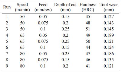 In this research, ceramic tools are used to machine Inconel 718 in order to find the appropriate cutting conditions. Ceramic insert (TNMG 160408 A65) with tool holder is used for this investigation. The experiment is conducted on automatic lathe. The wear of tool insert was measured using Tool maker’s Microscope. The objective focus of this work has been to find most dominant feature of tool wear with ceramic insert with dry machining. Experiments have been conducted at four cutting parameters (speed, feed rate, depth of cut and hardness) with three levels for each cutting parameter and the experimental data are presented in Table 1.