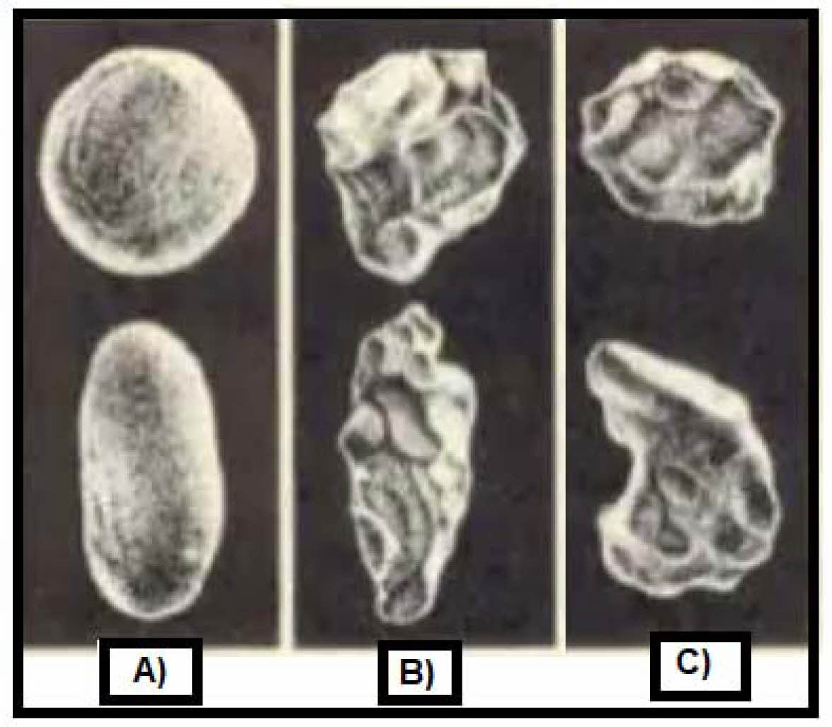 Fig. 1 Grain sand shapes categories: (A) rounded sand, (B) angular sand, and (C) sub-angular sand. |