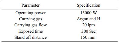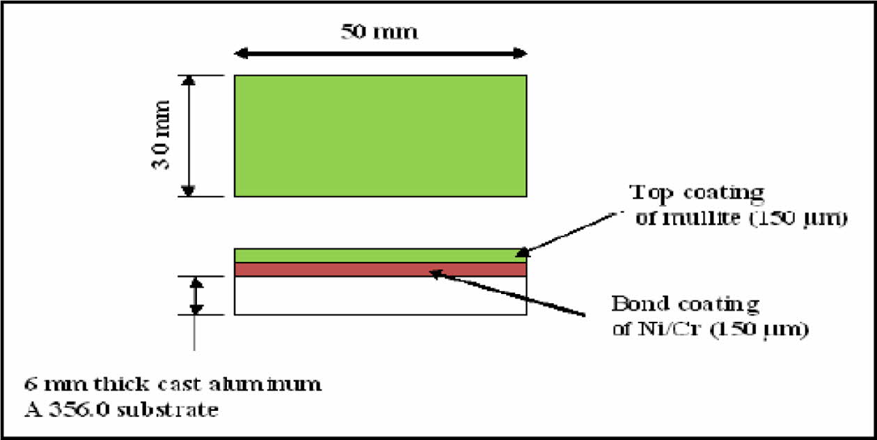 The plasma spray coating of NiCr intermittent bond coat – 150 µm thick and over coat of Mullite – ZrO2 and Mullite - La2O3 coatings 150 µm thick on A356 aluminium alloy was processed using 15kW plasma torch. The plasma spraying parameters are listed in Table 2 [27].