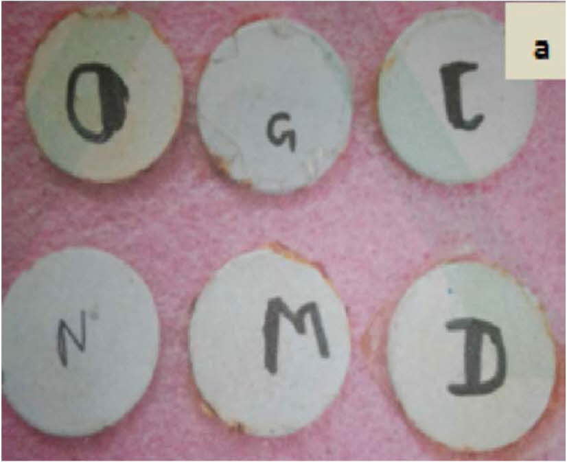 Fig. 4 ML and MZ Test specimens after salt spray test for 100 hrs (O as MZ1, G as MZ2, C as MZ3 and N as ML1, M as ML2 and D as ML3 coatings). |