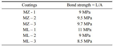 The results of tensile test performed as per ISO – 1608 of the double layered MZ and ML coated specimen are listed in Table 3. The tests were performed to determine the improvement in the tensile of the MZ and ML coated with uncoated test bars. It is commonly reported that ceramic materials has poor tensile strength and good compression strength. e.g. alumina has tensile and compressive value of 1,100 MPa and 2,400 MPa respectively. The results of MZ/ML coated specimen confirms better in the tensile strength.