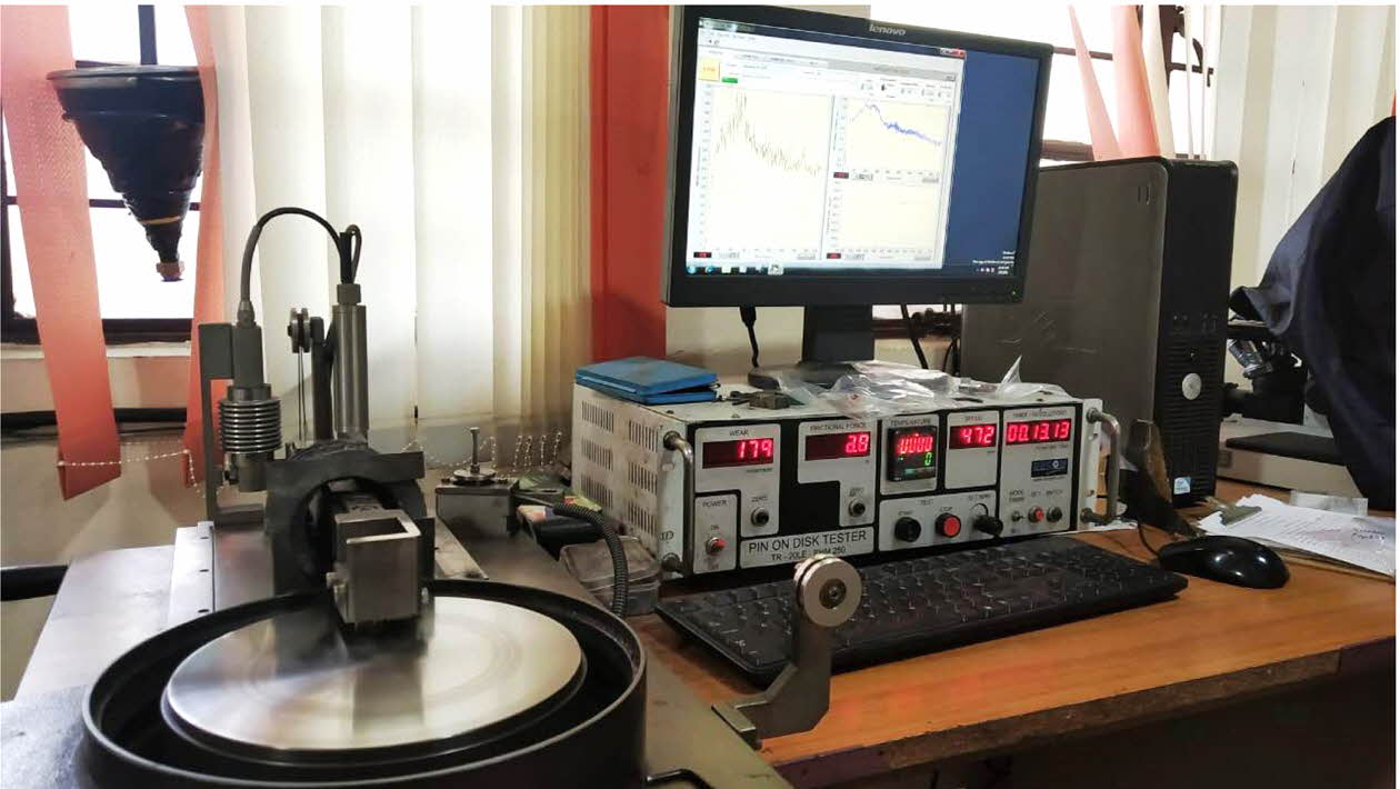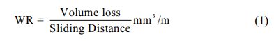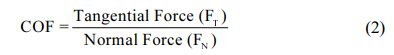 The coefficient of friction (COF) was attained by using Eq. (2). For the calculation, FT is found from the load cell fixed in the pin-on-disk apparatus.