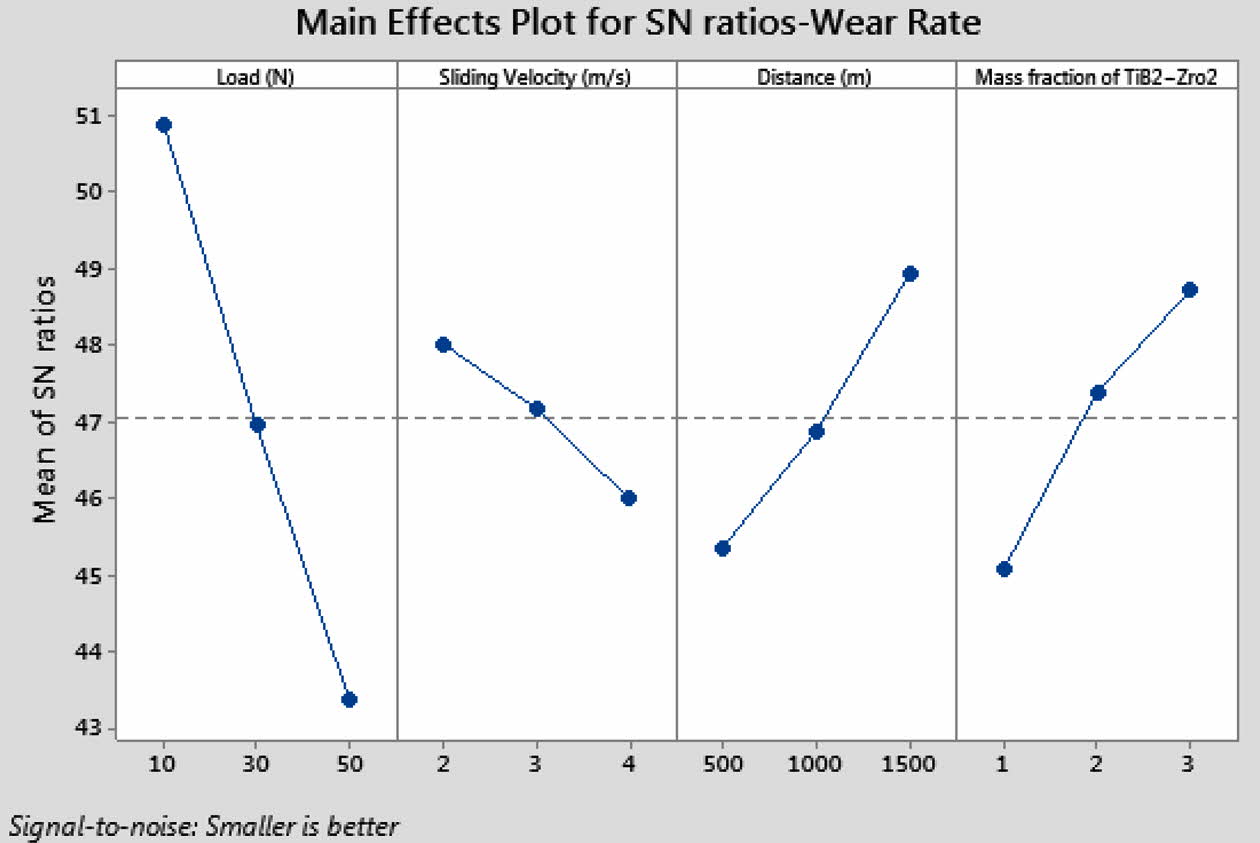 > Among the four wear parameters, load has shown highest impact (61.54%) on WR followed by reinforcement of TiB2 + ZrO2 particles on the basis of ANOVA results and found that the addition of TiB2 imparts significant improvement in wear resistance rate.