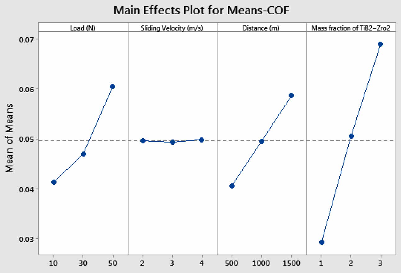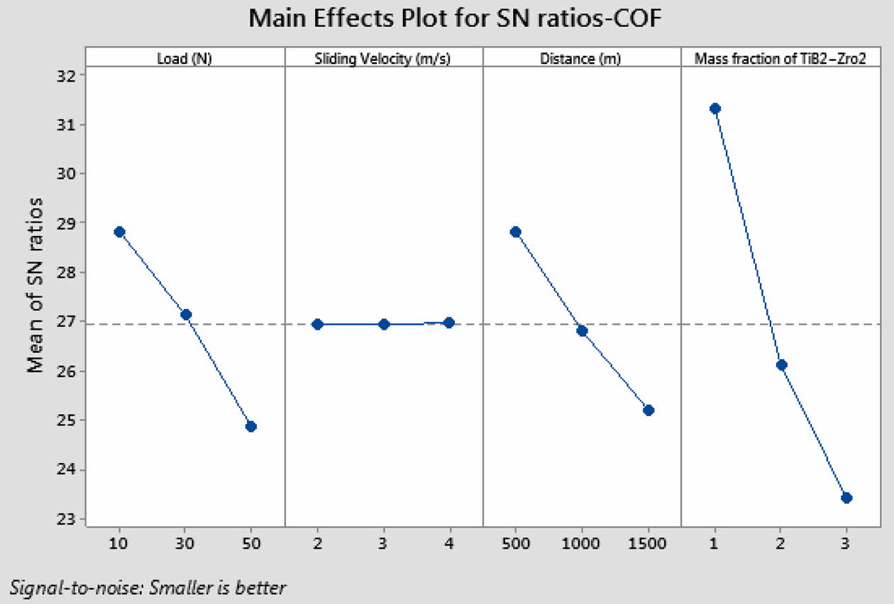 The mean and SN ratio plot for coefficient of friction (COF) are provided in Fig. 7 and 8. The COF increased with the increase of load and sliding distance. No significant change was observed in COF with respect to sliding velocity. It is evident that the COF get reduced with the increase in the wt.% of ZrO2 in all these Al hybrid composites. This is because of the presence of evenly distributed ZrO2 particles and the characteristic strength of the ceramic. This result agrees well with the findings of Naguib G. Yakoub 2020 [22]. Minimum COF was observed at load 10 N, sliding velocity 2 m/s, distance 500 m and reinforcement of 0.5% TiB2 + 2.5%ZrO2. Reinforcement of TiB2 + ZrO2 particles has exhibited dominant influence (65.48%) on COF followed by applied load (16.17%) and sliding distance (13.48%) as observed in Mean response of Table 4 and analysis of variance of Table 5.