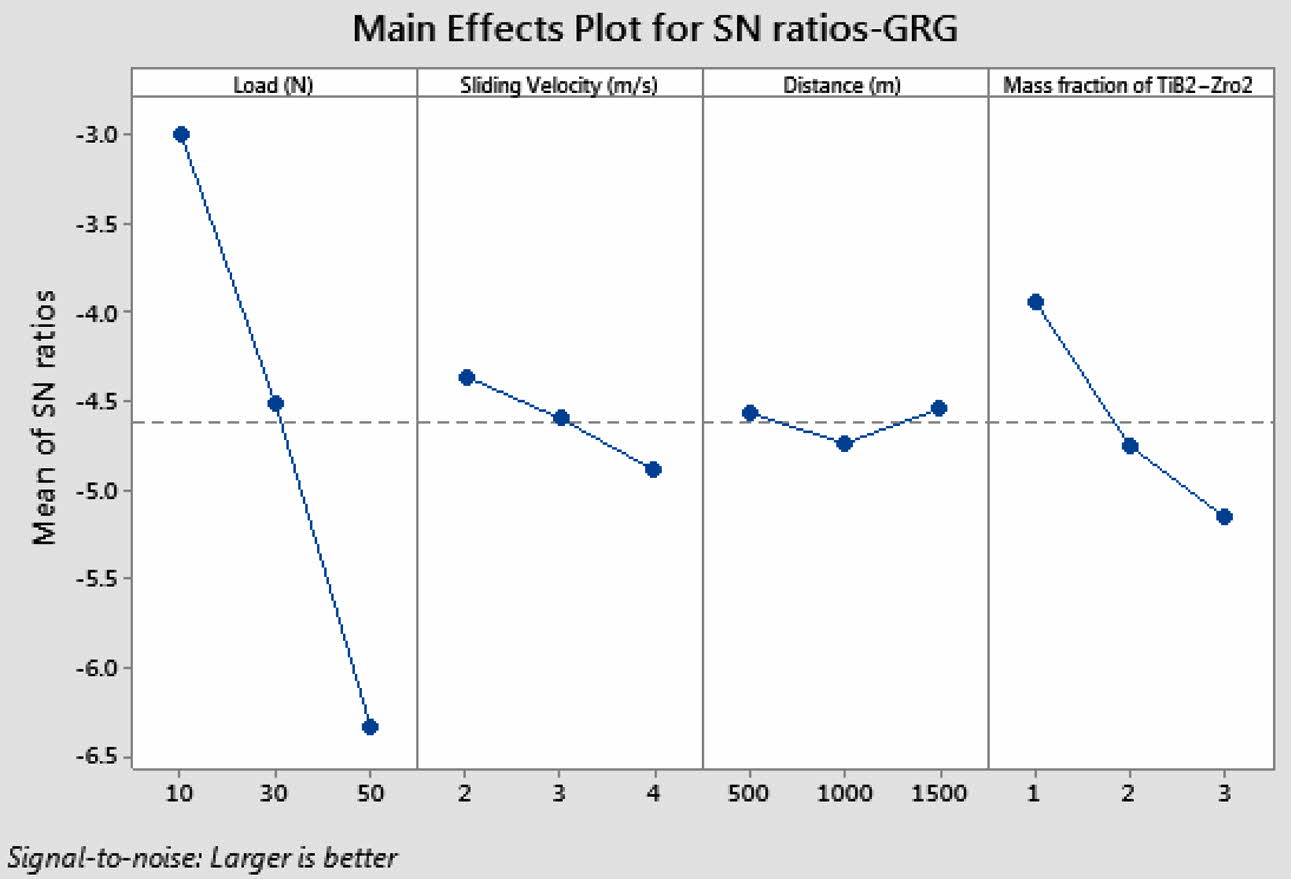 Based on the mean and S/N ratio graphs (Fig. 11 and 12) for GRG, 10 N load (Level 1), 2 m/s Sliding velocity (Level 1), 1500 m distance (level 3) and reinforcement of 0.5%TiB2 + 2.5%ZrO2 nano particles (Level 1) provide the optimal conditions to get the minimum WR and COF. The mean and analysis of variance of GRG (Table 9 and 10) indicates load as the strongest impact parameter on dry sliding performance characteristics with a contribution of 82.22% followed by reinforcement of TiB2 + ZrO2 particles. The parameters of sliding velocity and distance have not shown significant effects on simultaneous optimization of WR and COF.