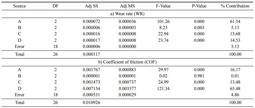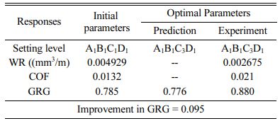 > WR of 0.002675 mm3/m and COF of 0.021 are obtained at optimal conditions and verified via validation test.