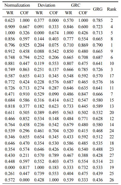 After normalization, the grey relational coefficient (GRC) is computed using the below expression.