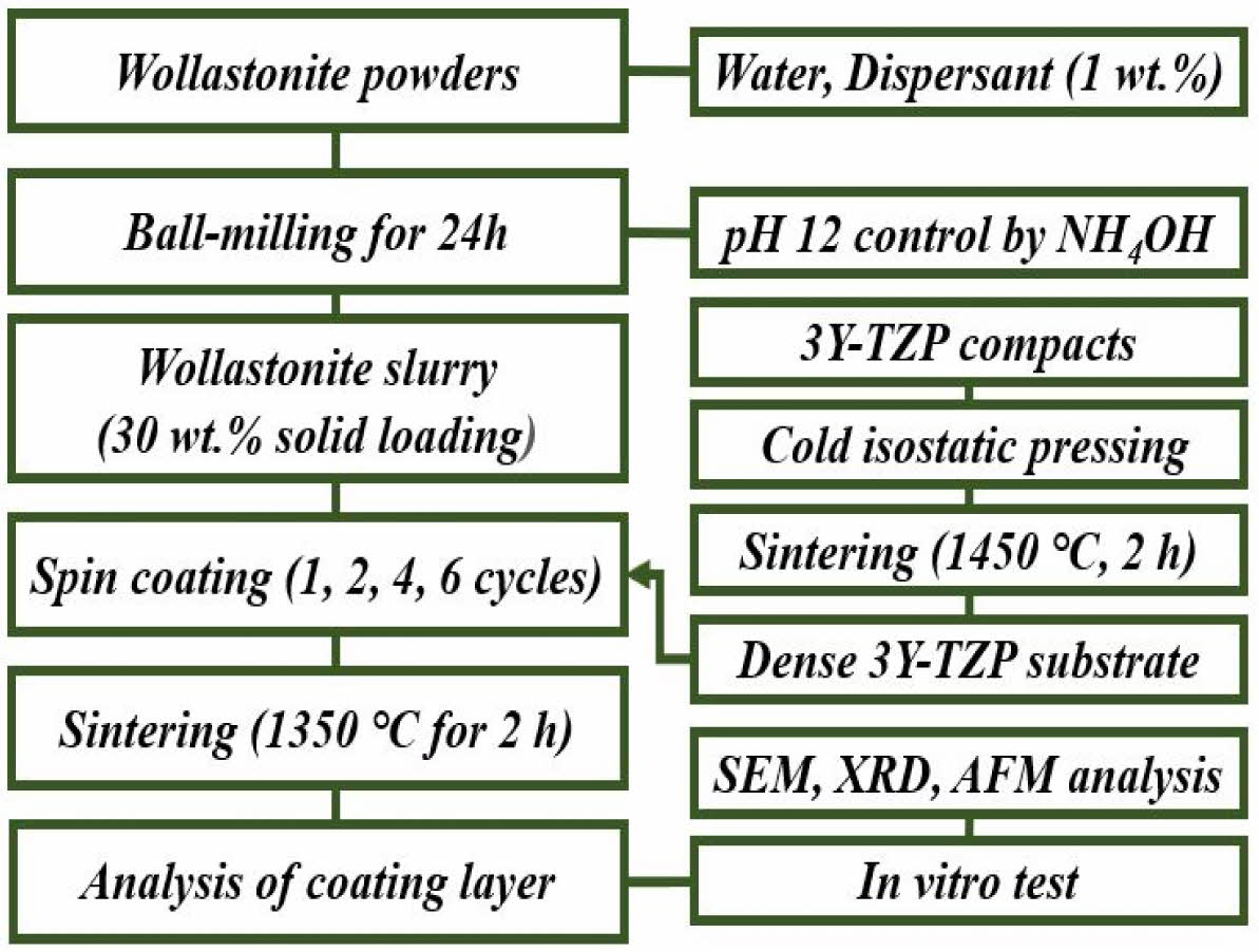 Fig. 1 Experimental procedure for slurry/spin coating of wollastonite on 3Y-TZP substrate. |