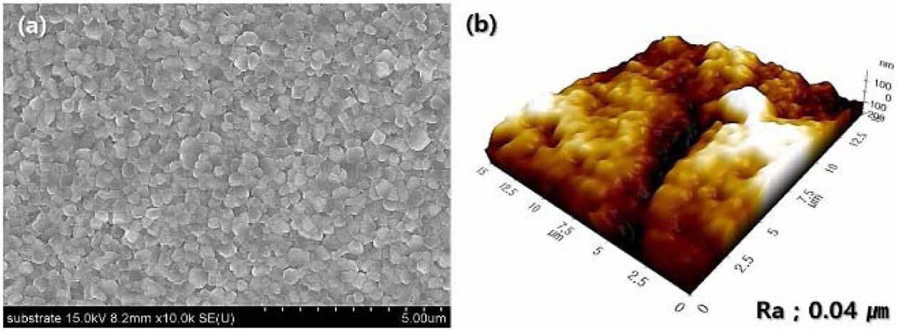 The microstructure and surface morphology of the 3Y-TZP substrate for coating are shown in Fig. 2. The dense 3Y-TZP substrate was fabricated by sintering with a small grain size of 360 nm and low surface roughness of 0.04 µm. In addition, the substrate had a high sintered density (6.04 g/cm3) and was composed of all tetragonal grains.