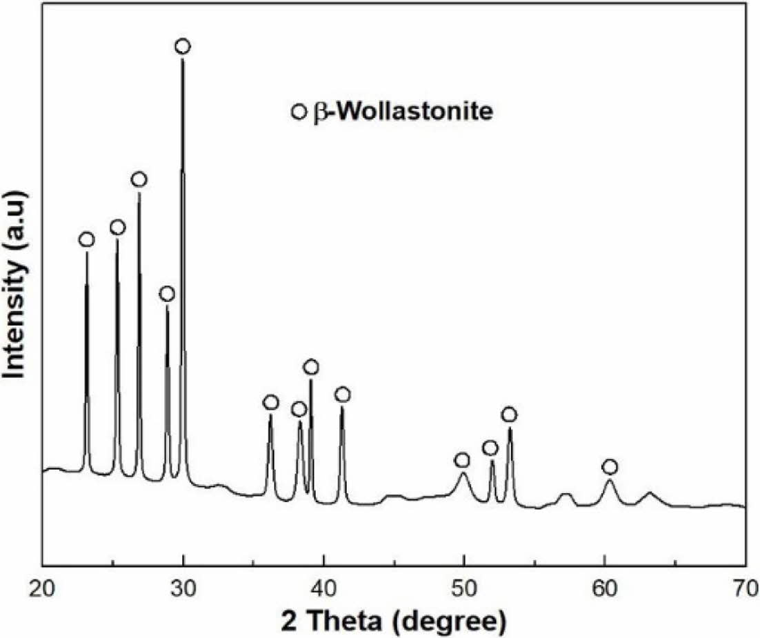 XRD of commercial wollastonite powder indicates a β-wollastonite phase composition, as shown in Fig. 3. Generally, natural wollastonite contains calcium silicate (CaSiO3) and is produced with a mixture of low aspect ratio powder and high aspect ratio fibers, as shown in Fig. 4(a). Theoretically, wollastonite consists of 48.25% of CaO and 51.75% of SiO2, also known as a white mineral, with a chain structure that has been used as a bioactive material in tissue repair and tissue engineering because of its bioactive and degradable properties [32, 33].