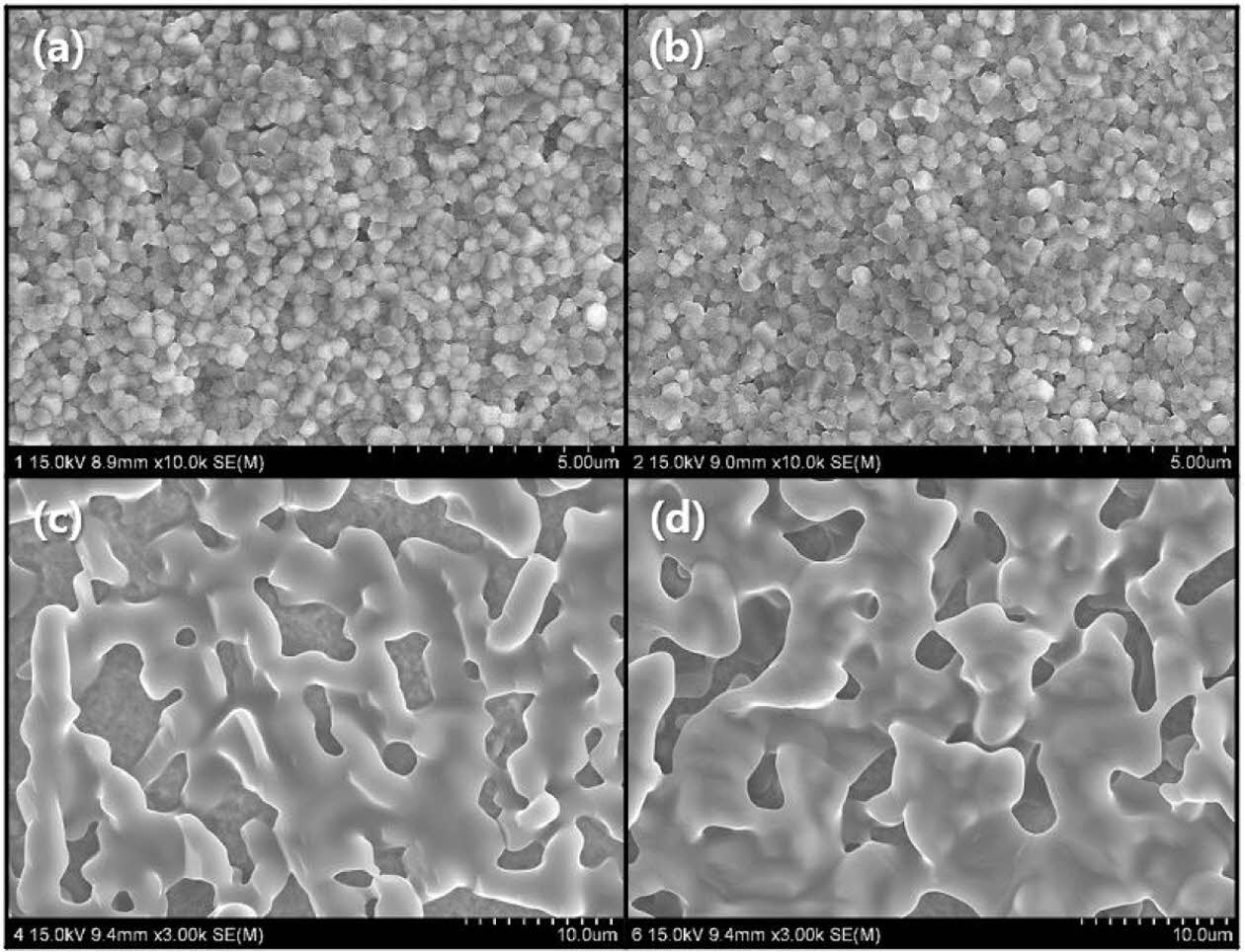 To homogenize commercial wollastonite powder, ball milling was performed for 24 h. Slurry coating was carried out using a spin coater to fabricate a uniform wollastonite coating layer. First, the zirconia substrate was fixed on the center of the spin coater and a droplet of wollastonite slurry was pipetted onto the zirconia substrate while rotating at 3000 rpm for 60 s to form a coating layer. To obtain a thick coating layer, spin coating was repeated after drying for one to six cycles. Dried specimens after final coating were densified by heat treatment at 1,350 oC for 2 h. The microstructural evolution and phase composition of the wollastonite-coated layer on the zirconia substrate were analyzed by scanning electron microscopy (SEM) and X-ray diffraction (XRD). The surface morphology was investigated by atomic force microscopy (AFM), and the surface roughness was measured from AFM images.