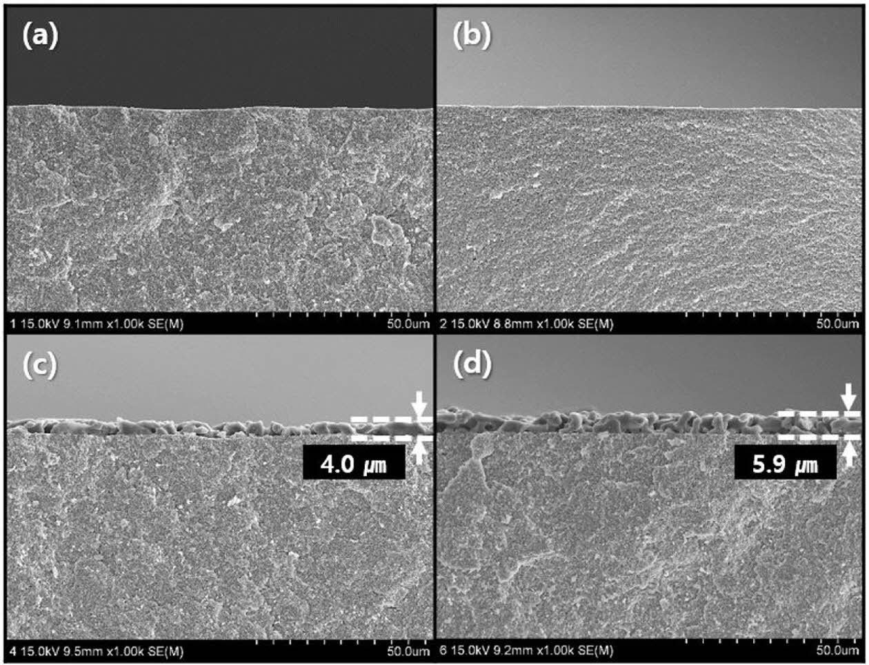 To observe the interface between wollastonite and the 3Y-TZP substrate and to evaluate the thickness of the coated layer, the perpendicular microstructure of the coated layer was observed through SEM, as shown in Fig. 6. As shown in Fig. 5, an appreciable wollastonite-coated layer was not observed on the specimen surface with one or two coating cycles, as also shown in Fig. 6(a) and (b). In contrast, thick wollastonite-coated layers (4.0 and 5.9 µm) were formed on the surface of 3Y-TZP substrates with four or six coating cycles, as shown in Figs. 6(c) and (d), respectively. Wollastonite particles were uniformly attached to the 3Y-TZP substrate and a porous structure was deposited with one or two layers. The wollastonite-coated thickness and packing density of the wollastonite particles on the coating layer increased slightly with repeated coating cycles. Generally, slurry/spin coating involves a simple and inexpensive process and has the benefit of producing a thick coating layer (< 20 μm), compared to sol–gel coating method. For long-term clinical stability, slurry coating is suitable because of its thicker layer and relatively slower dissolution rate [34, 35].