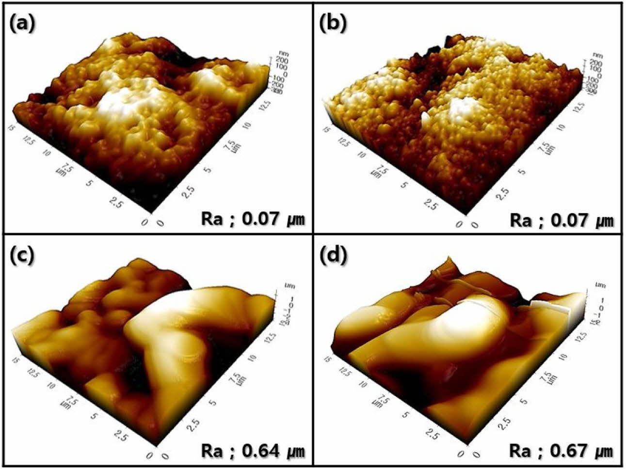 Similar characteristics were investigated for the surface morphology by AFM, as shown in Fig. 7. Surface morphologies comprising small zirconia grains were observed in the wollastonite-coated surface with one or two coating cycles; accordingly, the enhancement in the surface roughness of the coated layer was insignificant compared to that in the starting 3Y-TZP substrate. In contrast, the surface morphology of wollastonite-coated specimens with four or six repeating coating cycles comprised large wollastonite grains; consequently, the surface roughness of the 3Y-TZP substrate was improved by more than 10 times.
