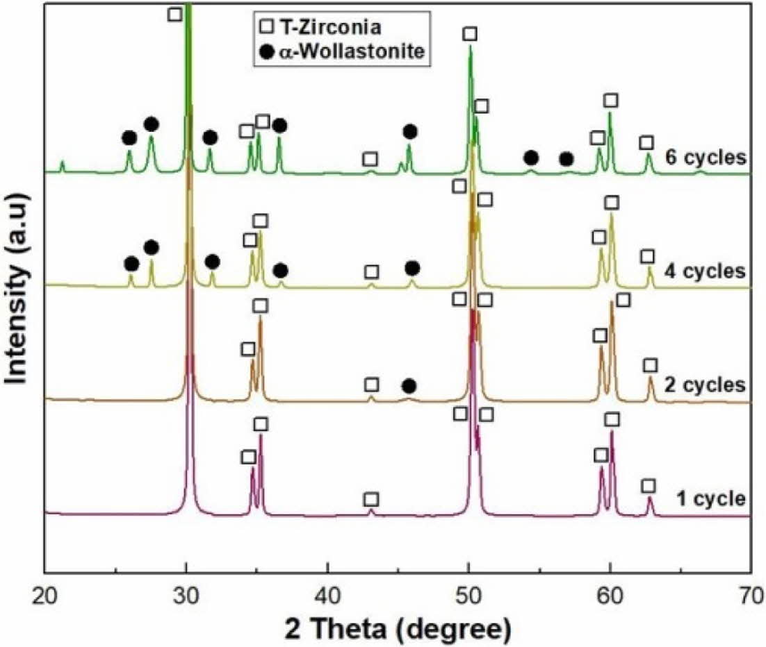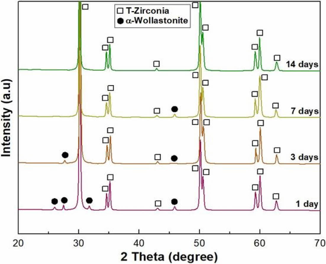 Excellent biomaterials exhibit appropriate surface chemistry and surface topology with excellent mechanical properties, which promote cell attachment, growth, and tissue formation in the body [1, 2]. Calcium phosphate- and calcium silicate-based ceramics have bioactive and biocompatible properties that are similar to natural bone tissue, which creates a desirable environment for bone regeneration and promotes direct bone bonding after implantation [3-5]. However, most bioactive ceramics have shown mechanical instability due to their dissolution into body fluids and creation of surface cracks when implanted in the human body for long ceramics have been used extensively as a period [6]. Meanwhile, zirconia and alumina femoral and dental components have excellent mechanical properties, good wear and corrosion resistance, and biocompatibility [7, 8]. However, these two ceramics possess bioinert properties; they do not directly bind to the bone during implantation, and thus, their use in medical applications has been limited [9].