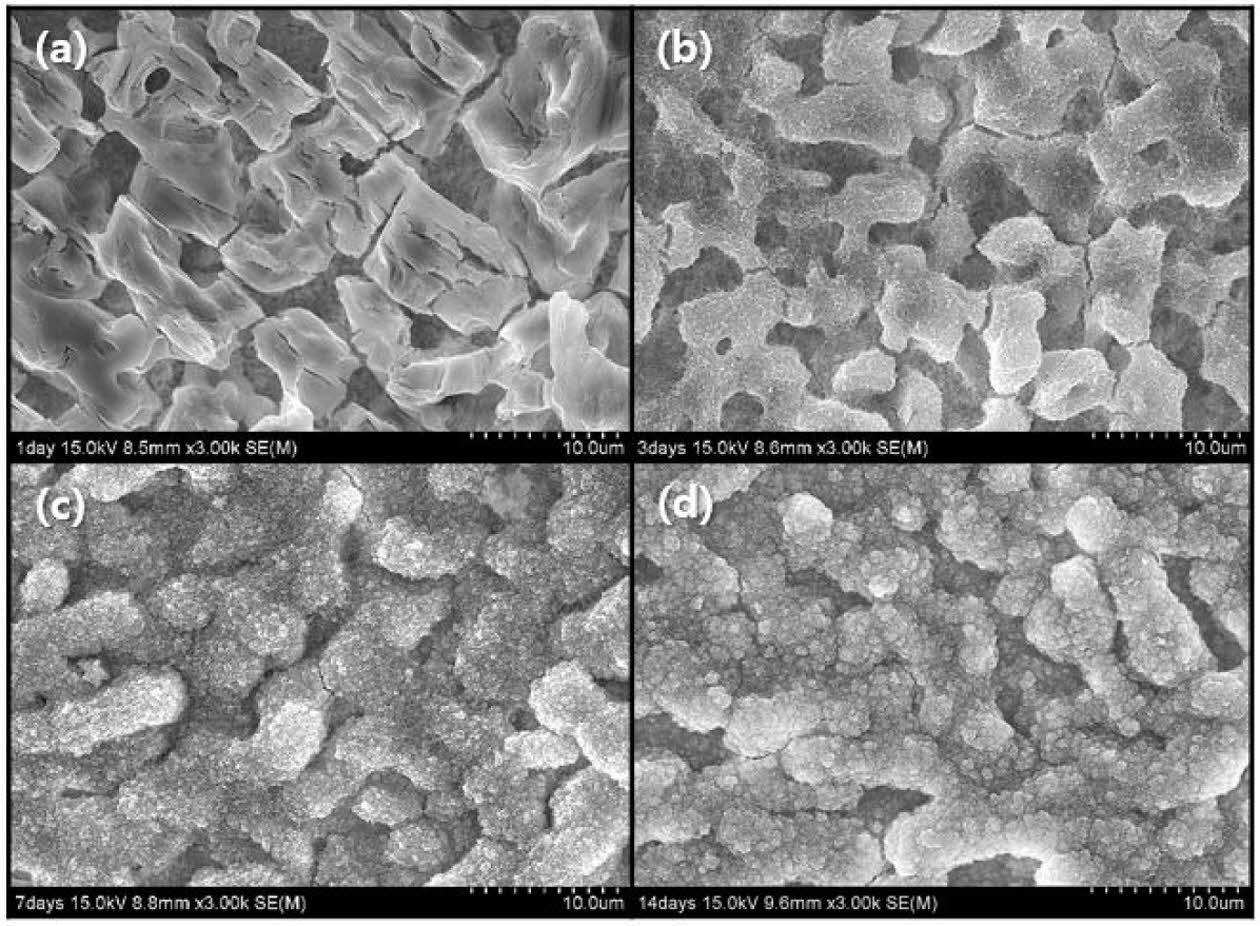 Fig. 9 Microstructural change in wollastonite-coated layer fabricated by 4 coating cycles after in vitro test in SBF solution with immersion period: (a) 1, (b) 3, (c) 7, and (d) 14 days. |