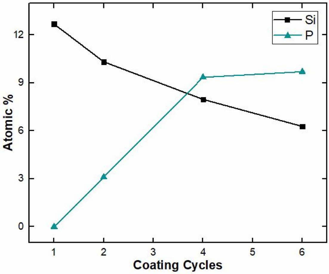 The phase composition on the surface of the wollastonite-coated layer with repeated coating cycles was observed through XRD analysis, as shown in Fig. 8. Distinct wollastonite peaks were found on the wollastonite-coated specimens with four and six repeating coating cycles, but wollastonite peaks were insignificant or almost not observed on coated specimens with one or two repeating coating cycles. The phase composition analysis of the coated surface agreed with the micro- structural observations. Unlike the starting powder composition of β-wollastonite, the coated layer was found to be α-wollastonite resulting from a phase transition during the final heat treatment at 1,350 oC for 2 h. Generally, wollastonite can be classified as α- or β-wollastonite, where α-wollastonite crystals have a pseudo-hexagonal structure, while β-wollastonite crystals have a triclinic structure. The β-wollastonite phase was identified by the calcination of wollastonite between 800 and 1,130 oC, and the α-wollastonite phase was identified when the temperature exceeded 1,130 oC [33, 36].