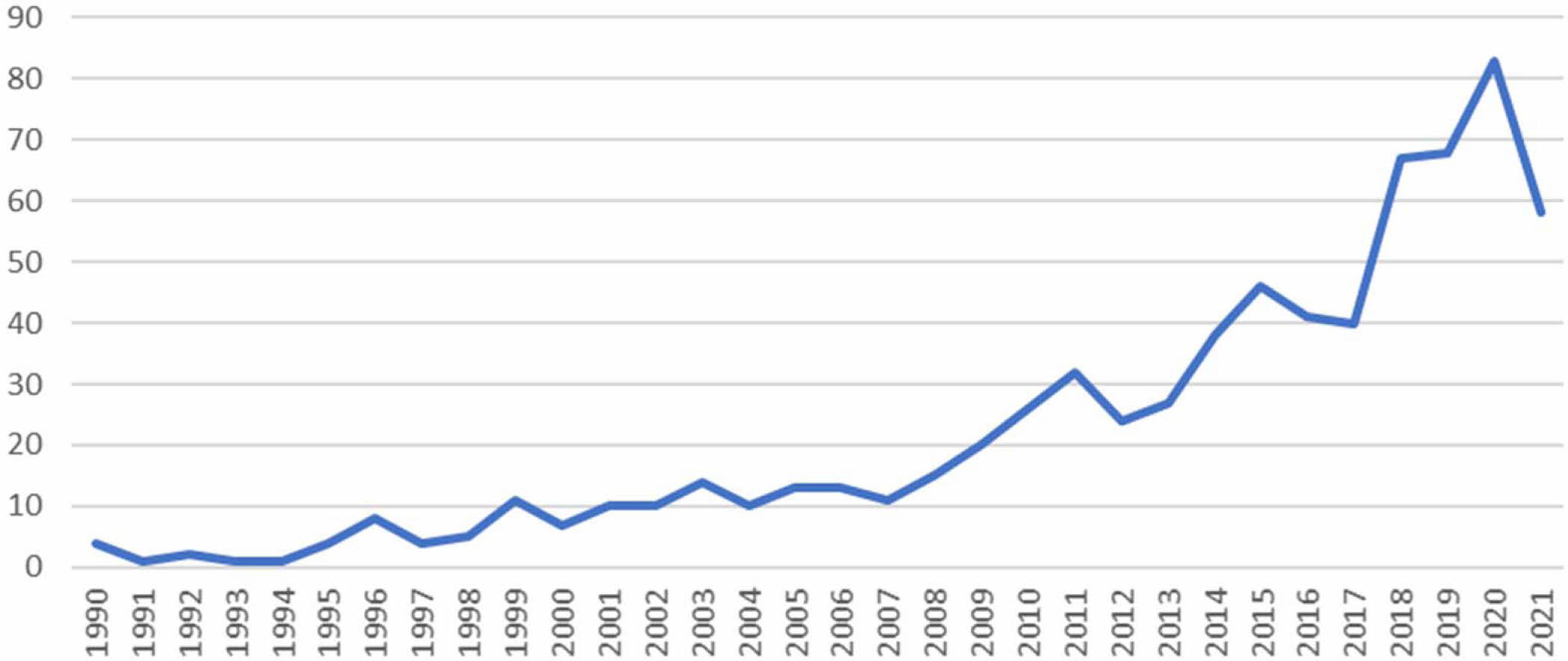 According to the search results, a broken line graph of the number of articles published on the application of ceramics in textiles from 1990 to 2021 was drawn. As shown in Fig. 1. Article publication is the most direct manifestation of research results and directions in a field. The number of articles published in a certain research field reflects the research results, the development speed of this field, and the degree of attention of researchers in this field [13].