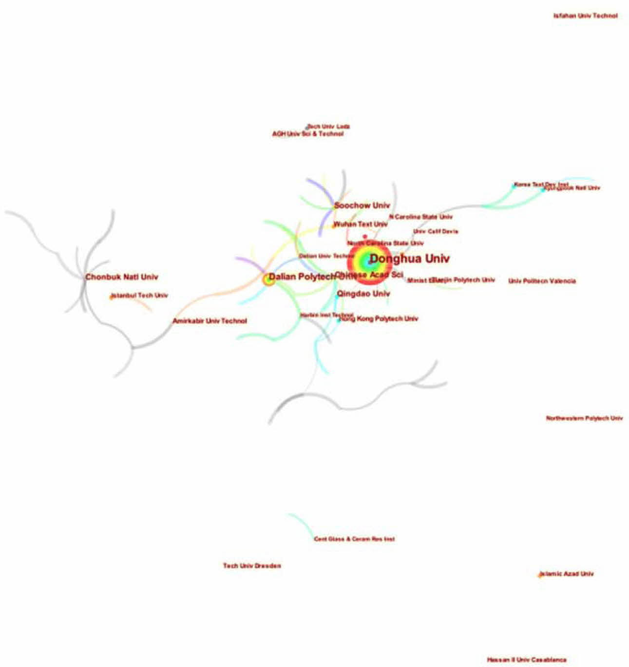 Through the analysis of the distribution of research institutions, in addition to getting rid of the overall situation of the country, we can explore the current key research institutions in this field, this is the focus of academic research in this field, it is also convenient for researchers to understand the distribution of research forces in this field. The node type selects “Organization” and other parameters default, obtain the research collinear map of ceramic textile institutions (Fig. 2), in the co-occurrence network diagram, the number of occurrences of the node size indicator is high, reflecting the important status of the research institution, the more connections indicate the greater the number of partnerships, the thicker the connections indicate the stronger the degree of cooperation. As can be seen from the figure, the most frequent ones are Donghua Univ (Donghua University), Dalian Polytech Univ (Dalian University of Technology), Chinese Acad Sc (Chinese Academy of Sciences), Chonbuk Natl Univ (Chonbuk National University, South Korea), these institutions are all located in East Asia, it can be seen that the research on the application of ceramics in the textile field in East Asia is located in the world's leading area. At the same time, it can be seen from the figure that there are fewer cooperative relations among major institutions, the cooperation relationship is not close, and the cooperation in the field of ceramic textile application in Asia and Europe needs to be strengthened in particular [18].