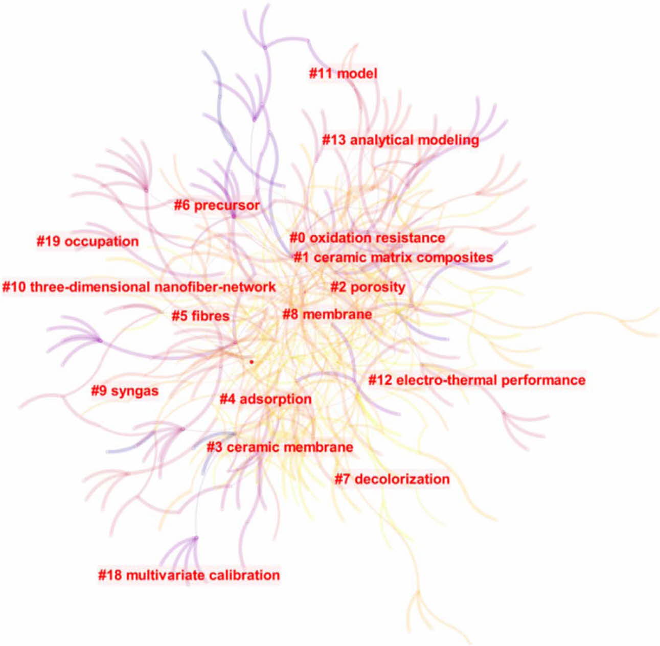 Research on the basis of mapping the frequency of keywords, use the LLR algorithm to perform clustering analysis on keywords, generated the “ceramics in textile application” research keyword clustering map (Fig. 4) and subject terms, refer to the corresponding results of the keyword and topic word map, it is found that the main research hotspots of ceramics in textile applications are: The first direction is the performance research of ceramic textiles, specifically including #0 and #2 and #3#6, Kubiliene, Diana have proved through experiments that the thermal insulation effect of ceramic textiles is stronger than that of general textiles. Jur, JS researched nano-scale ceramics to change the surface properties of textiles through atomic layer deposition, Yan, Jianhua uses a simple domino cascade reduction method, make ceramic nanofiber textiles quickly transform from insulation to electrical conduction at room temperature, it breaks the recognition that oxide ceramics are considered non-conductive brittle materials. Sankauskaite, Audronehi used different ceramic additives to study the endothermic behavior of textiles, it is believed that the 3D knitted fabric ceramic containing Ti is in the test sample, additives show the highest emissivity, which means that this sample radiates its energy more efficiently than other samples. Jiang, Fengyang's second direction is the preparation technology of ceramic textiles. Specifically, including #4 and #5#7, Leung, Ting-Kai studied the usefulness of bioceramic materials (ceramic materials that emit high-performance far-infrared (FIR) rays) that are processed into fabrics using traditional manufacturing melt spinning methods, Rossall, Michael N. researched the techniques used to characterize the towing structure and defects in woven ceramic composites, in order to generate high-fidelity geometric models and then detect the effect of defects on the properties of composite materials. Hong, Ying Based on the template-assisted sol-gel method, the three-layer ceramic fabrics are interwoven to produce fiber ceramic fabrics.
