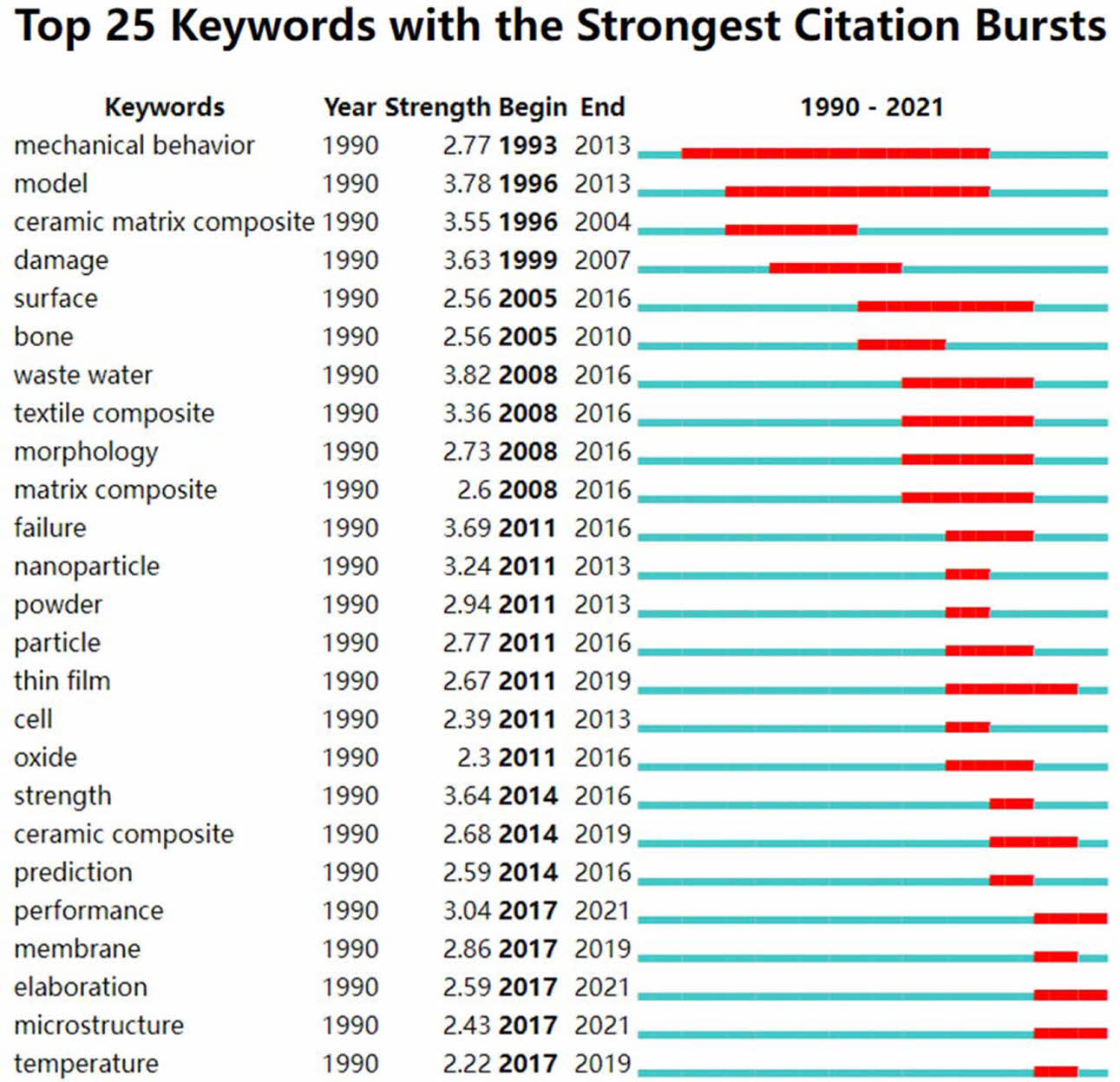 Emergent words refer to words that appear rapidly in a certain period of time, you can judge the frontier of a research field based on it, using the mutation detection function of Citespace, draw an emergent map of keywords (Fig. 7). The picture shows that when the application of ceramics in textile-related fields has developed to a certain extent, keywords of a certain strength that appear and the course of their appearance and disappearance, these keywords are hot words in the research on the application of ceramics in textiles in different periods, the red line in the figure represents the time interval during which the keyword’s emergence occurred, Begin and End represent the start time and end time of the mutation, respectively, Strength represents the “emerging” strength of the keyword, the larger the value, the greater the impact of the keyword in the corresponding time interval of the research field. As can be seen, the keyword “mechanical behavior” is the longest and the first to emerge, from 1993 to 2013, the word with the highest emergence is “wastewater”, it may be related to the importance of ceramic membranes' ability to treat wastewater in the textile field. From an overall point of view, the emergence of keywords is consistent with the application and research phase of ceramics in the textile field. The prominent words that appeared in this stage from 1993 to 2005 include “model”, “surface”, “damage”, and “ceramic matrix composites”, and the appearance time is relatively long, and it has been the focus of research in this field since its creation. There were more prominent words in the period from 2008 to 2014 than in the previous period, there are mainly “failure”, “matrix composites”, “powder” and “particle”. Although the overall emergence intensity is not as high as the first stage, however, it shows that this stage is a period of rapid development in the ceramic textile field, various research hotspots have emerged one after another. 2017-now belongs to the third stage, many prominent words at this stage have not disappeared, emerging words such as “microstructure”, “elaboration” and “performance”, although appearing for a short time, but the emergence intensity is high, and it will continue to emerge in the future, it is an important research object of ceramics in textile applications at present and in the future.