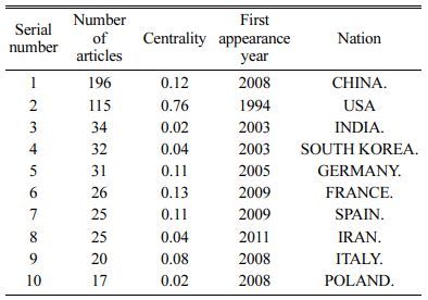 A certain discipline and field have to be developed, thanks to the attention of scientific researchers, however, the demand and promotion behind the country and region are also important factors in the development of this discipline and field. Analysis of the distribution of countries that publish literature in scientific research is conducive to scientific research personnel to clarify their development status, learn from field experts in the countries that have advanced in development [15]. Through combing the related literature of ceramic textiles, get the top 10 countries for publications. As can be seen from Table 1, the ceramic textiles are more evenly distributed, mainly distributed in China, Britain, India, South Korea, Germany, France, and other countries. China is a leading country in the publication of ceramics in textile applications, but the earliest included in the WoS core library was in 2008, and it was later included, it should be affected by the language and the degree of internationalization of our country, but it also reflects the rapid development of China's ceramic textile field in recent years. The country with the earliest documents included in the WoS core database is the United Kingdom, and its total documents are second only to China, ranking second [16].