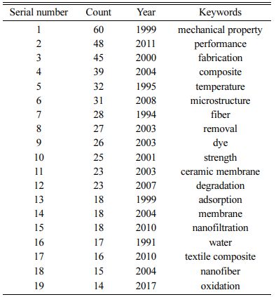 Since 1990, the number of publications on the appli- cation of ceramics in textiles has shown an overall upward trend, according to the number of publications, it can be roughly divided into three stages. During the six years from 1990 to 1996, the number of publications on the application of ceramic materials in textiles was less than 10, at this stage, overall research efforts are not strong, the number of published documents is small, and the research is in its infancy stage. From 1996 to 2007, the total number of publications increased significantly compared with the previous period, however, the volume of annual publications is still relatively small, which shows that the application of ceramic materials in textiles at this stage has attracted the attention of researchers. After 2007, the number of documents increased in a large amount, and quickly surpassed the sum of the number of publications in the previous 17 years, indicating that the academic community paid great attention to this field at this stage [14].
