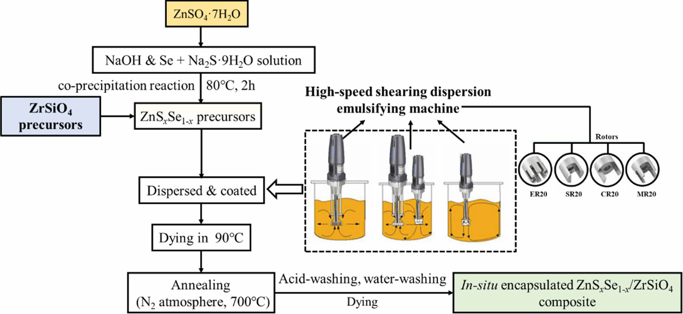 For preparation of ZnSxSe1-x@ZrSiO4 (labeled as ZS@ZrSiO4) compositecool pigment, ZnSxSe1-x (labeled as ZS) precursor particles were synthesized via co-precipitation reaction, the optimum process of ZnSxSe1-x precursor synthesis was described in a previous work [31] and the atomic ratio of Zn:S:Se is 1.00:0.35:0.65. Afterwards, ZnSxSe1-x precursor particles were mixed with soft mechano-chemical pretreated ZrSiO4 precursors in a model D-500 high-shear homogeneous dispersing emulsifier (Wiggens Co., Ltd., Germany) at a rotational speed of 20,000 rpm. ZS@ZrSiO4 precursors were calcined in N2 atmosphere at 700 oC for 60 min.