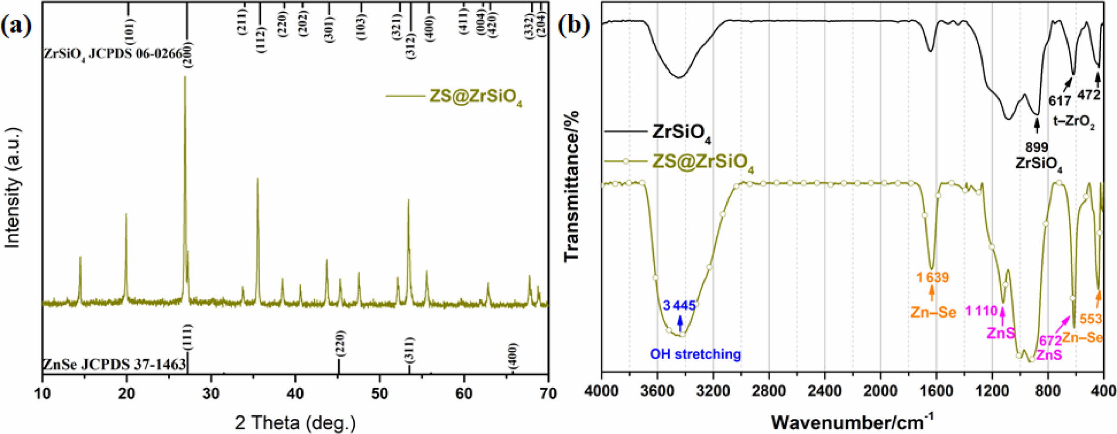 Fig. 4 shows XRD patterns and FTIR spectra of ZS@ZrSiO4 compositecool pigment sintered at 700 oC. The diffraction peaks of ZS@ZrSiO4 composite mainly consist of zircon phase (ZrSiO4, JCPDS card 06-0266) with high crystallinity degree, and a small amount of ZnSe (JCPDS card 37-1463) are detected (see Fig. 4(a)). It indicates that the coating process does not change the crystalline structure of ZnSxSe1-x pigment (i.e., ZnSe, cubic zinc-blende structure, space group of F-43m(216)) [31].