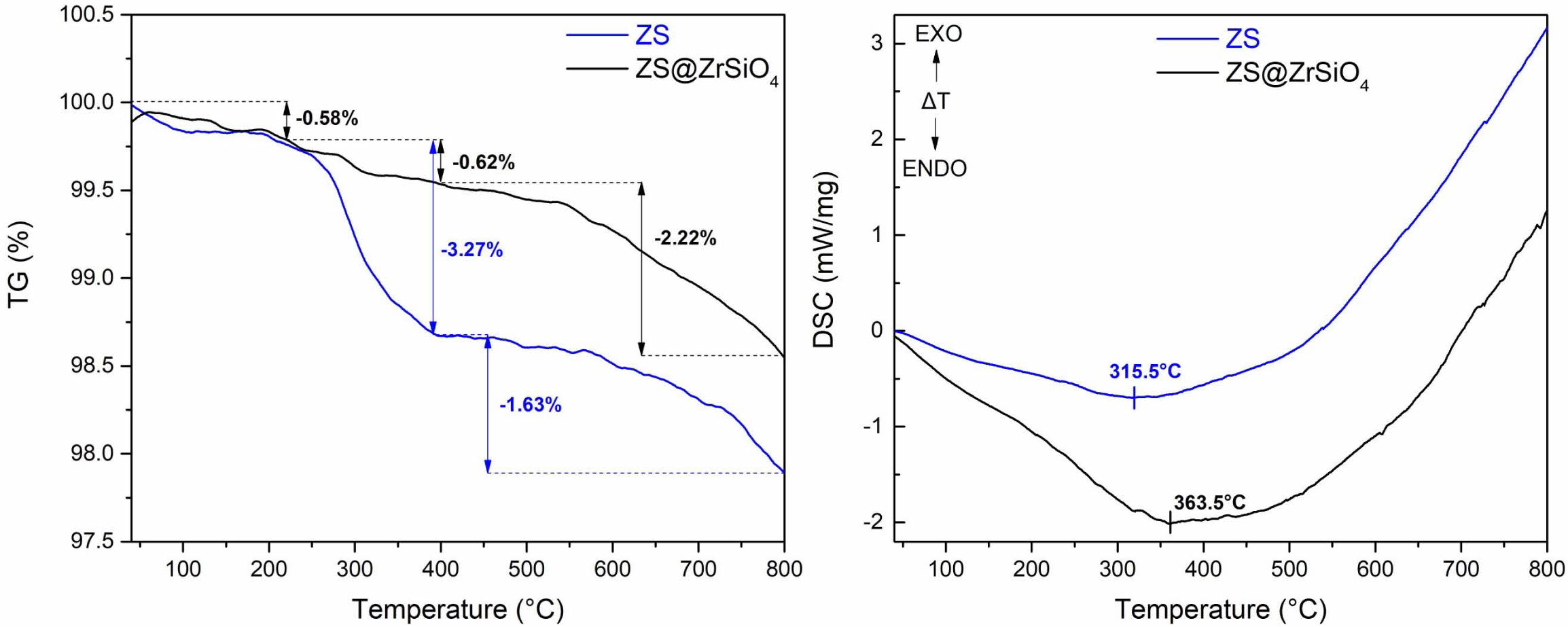 Fig. 5 TG-DSC curves of ZS and ZS@ZrSiO4 composite cool pigment. |