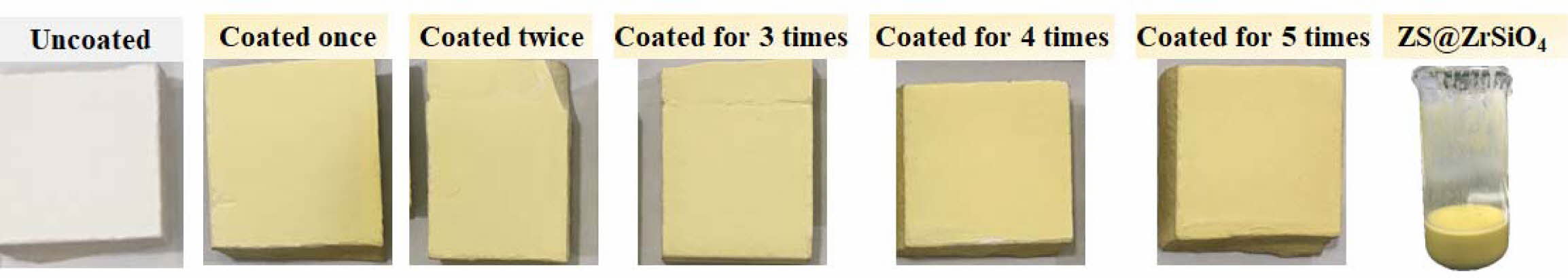 Photographs of as-prepared solar NIR reflective ceramic tiles see Fig. 6. All enameled samples with ZS@ZrSiO4 compositecool pigment exhibit a homo- geneous yellow hue, and the yellow chromaticity of samples enhanced with the increasing of coating times. It means that the as-prepared ZS@ZrSiO4 compositecool pigment has high thermal stability and tinting strength, which makes them suitable for ceramic decoration.