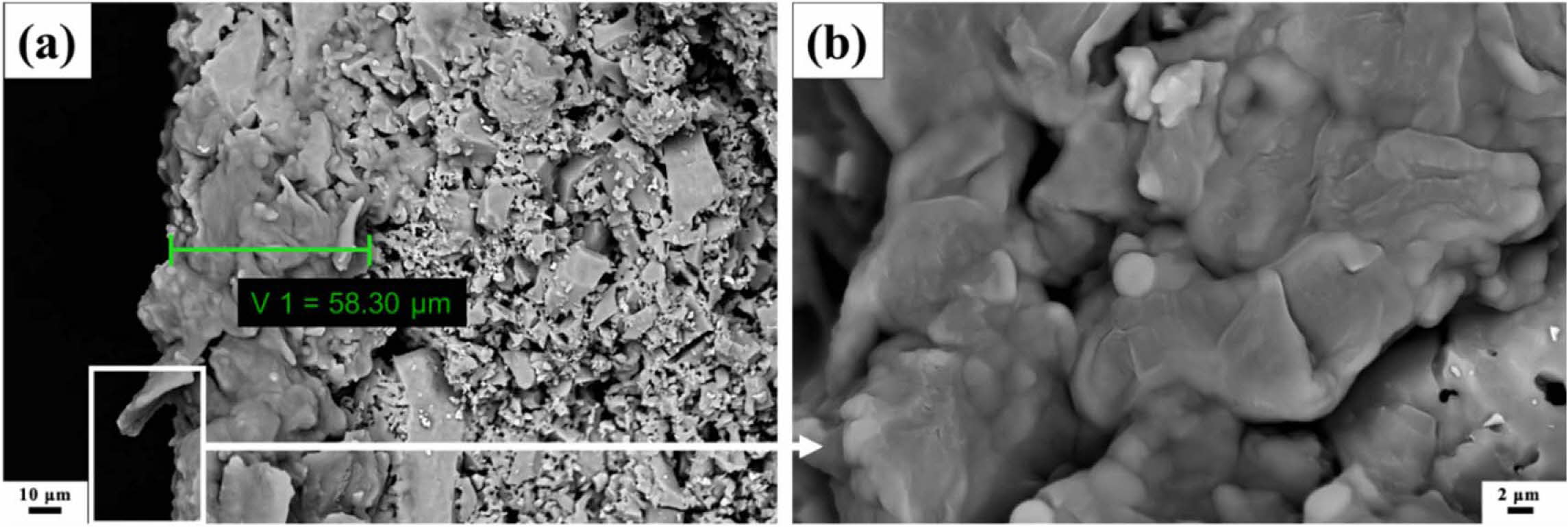 The cross-section of enameled sample with ZS@ ZrSiO4 compositecool pigment and coated for 3 times (i.e., ZS@ZrSiO4 glaze-3) was observed by SEM, and the thickness of glaze layer is 50-60 μm (see Fig. 7(a)). Fig. 7(b) shows the surface of ZS@ZrSiO4 glaze-3 sample. The glaze sample surface is rough and possesses a small amount of pin-hole defects.