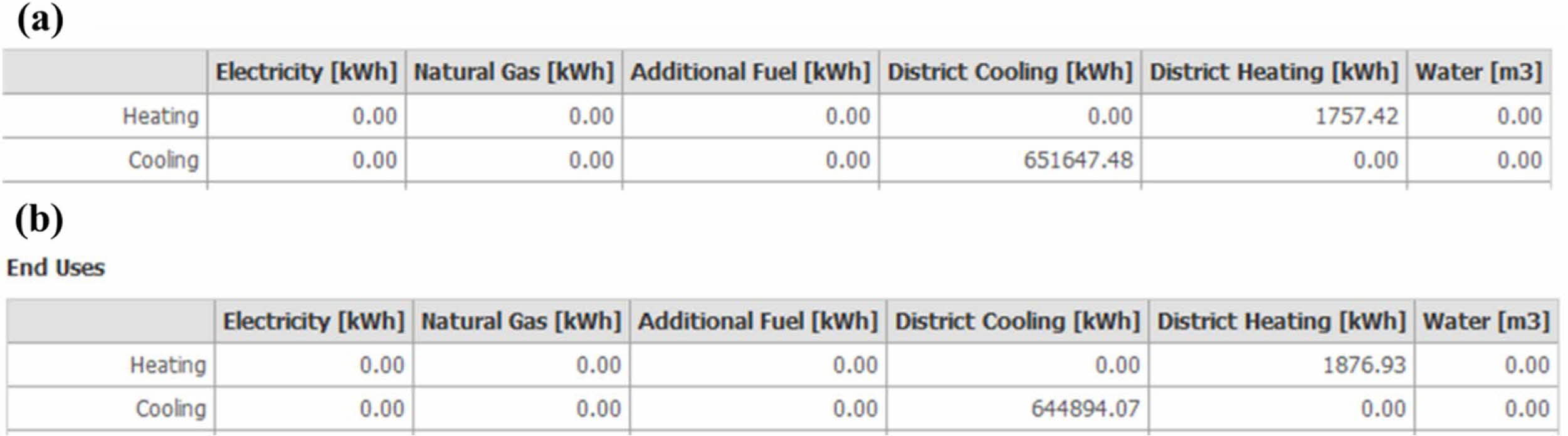Fig. 12 Annual district cooling load and heating load calculated by Design Builder, (a) cement wall and (b) solar NIR reflective ceramic tiles. |