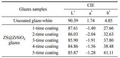 The color coordinates of solar NIR reflective ceramic tiles see Table 4. The L* values of uncoated glaze-white are 90.39, indicating that the as-prepared ceramic substrates have excellent whiteness. In the enameled samples with ZS@ZrSiO4 composite, the b* value of enameled samples rises from 27.66 to 41.11 with the increasing of coating times, and the color of all of the enameled samples are brighter yellow.