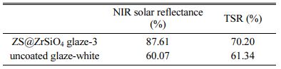 To evaluate the thermal insulation performance of solar NIR reflective ceramic tiles, Fig. 8 shows the comparison of NIR reflectance of the ceramic substrates (i.e., uncoated glaze-white) and enameled samples with compositecool pigment (i.e., ZS@ZrSiO4 glaze-3).