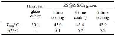 Compared with enameled samples with ZS@ZrSiO4 compositecool pigment, the uncoated glaze-white sample absorbed the most infrared radiation after exposing to the radiation for 10 min, resulting in the surface temperature rising to 50.1 oC (see Fig. 11(b)).