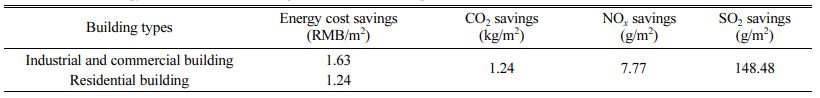 According to the Electricity price list of Guangzhou, China (effective from July 1, 2018), energy cost savings in the industrial and commercial building is 1.63 RMB/m2 and in the residential building is 1.24 RMB/m2 (see Table 8), and the emission reductions of CO2, NOx and SO2 are 1.24 kg/m2, 7.77 g/m2and 148.48 g/m2, respectively.