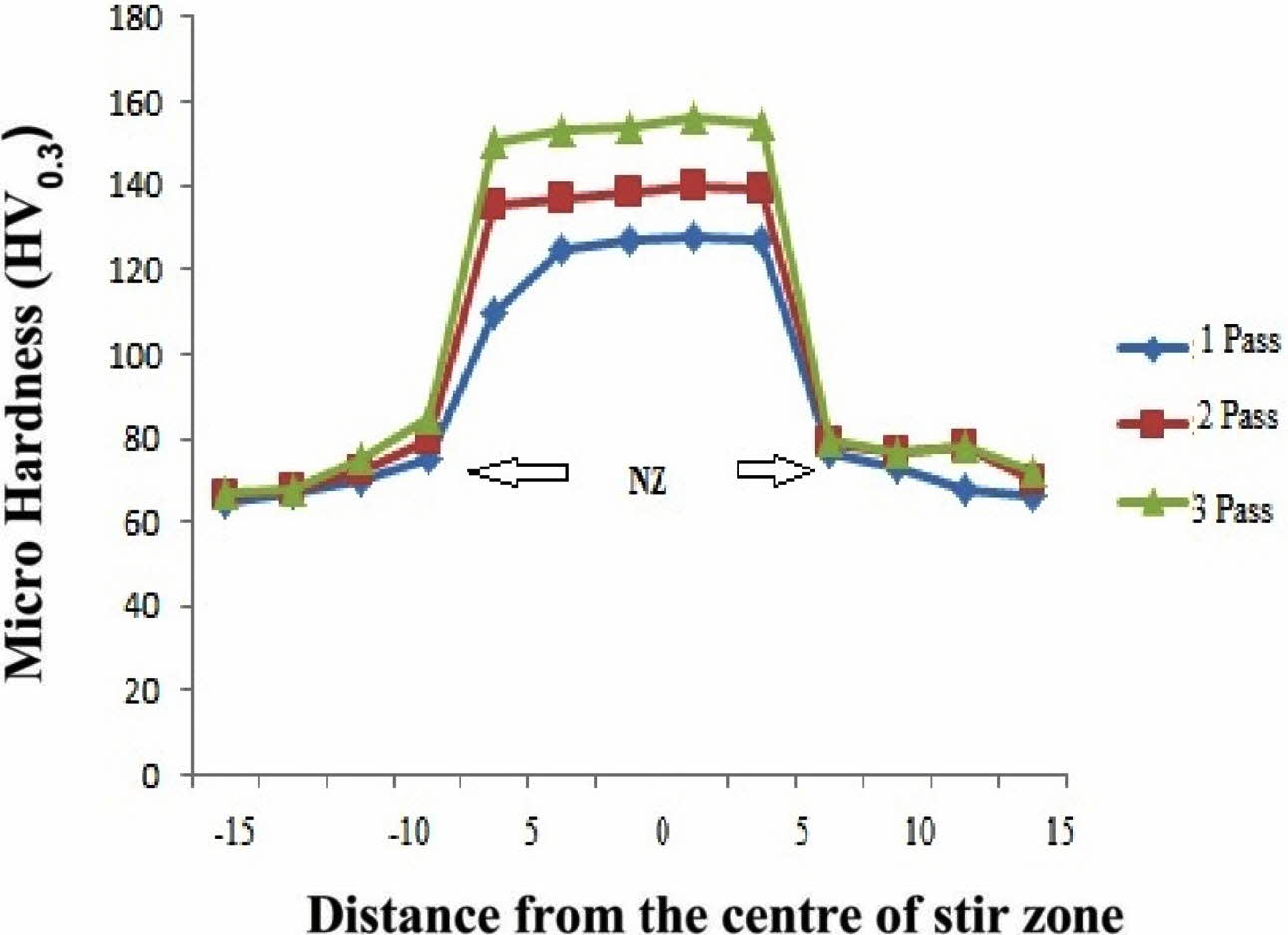 The micro hardness of AA7075/SiC & Gr is calcu- lated and shown in Fig. 4. From the Fig. 4, it is evident that the average micro hardness gradually increases at processed zone (Nugget Zone - NZ) from the base material. The maximum hardness of 156 HV is obtained in three pass AA7075/SiC and Gr compared to the base material AA7075 alloy (63HV). This is due to fine grain refinement and more density dislocation. From the experimental results, it is noted that the micro hardness gradually mounting i.e., 128 HV, 140 HV and 156 HV for 1 pass, 2 pass and 3 pass of AA7075/SiC & Gr respectively. This is due to incorporation of AA7075 with SiC and Gr with respect to Hall-Petch effect. The hardness of 3 pass AA7075/SiC & Gr is much better than other two specimens. This indicates the material flow and dispersion of article reinforcement is better compare to 1pass and 2 pass FSP AA7075/SiC & Gr. Formation of cluster is very less in 3 pass FSP AA7075/SiC & Gr and hence its hardness is higher. This result is verified with prabhu et al. [19]. Hardness is highly depends on cluster formation in friction stir processed specimen [20]. Due to homogeneous disper- sion of SiC & Gr with AA7075 alloy, minimum cluster particle and coarse grain gotten in 3 pass processed AA7075/SiC/Gr specimen and maximum micro hardness is obtained.